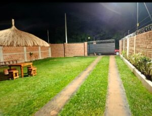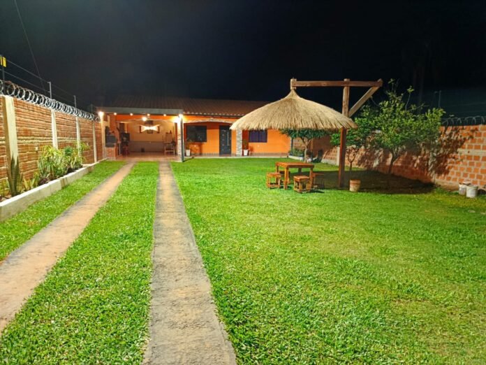 ✅ Quincho de paja central con mesa y sillas rústicas, totalmente iluminado